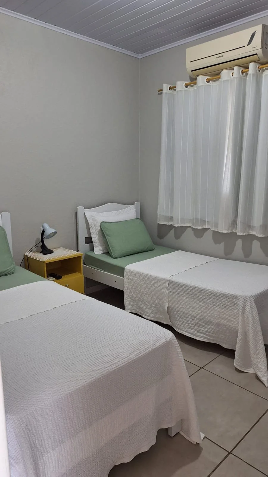 O quarto oferece duas camas de solteiro, banheiro privativo, ar condicionado e TV com Wi-Fi. Tudo que você precisa para uma estadia confortável e prática.
